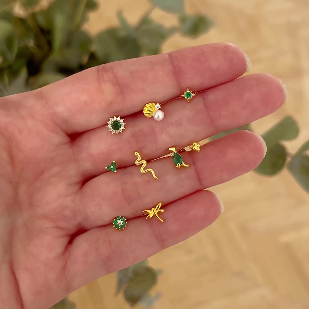 Un mini pendiente que se ha convertido en uno de vuestros favoritos. Tabi está elaborado en plata de ley y bañado en oro de 18k, con forma de flor de cinco pétalos decorada con circonitas blancas que aportan luz y elegancia a cualquier combinación. Su cierre de bola no solo lo hace más cómodo, sino también perfecto para llevarlo en segundos agujeros, helix o tragus. Un toque floral, brillante y versátil que queda bien con todo.
