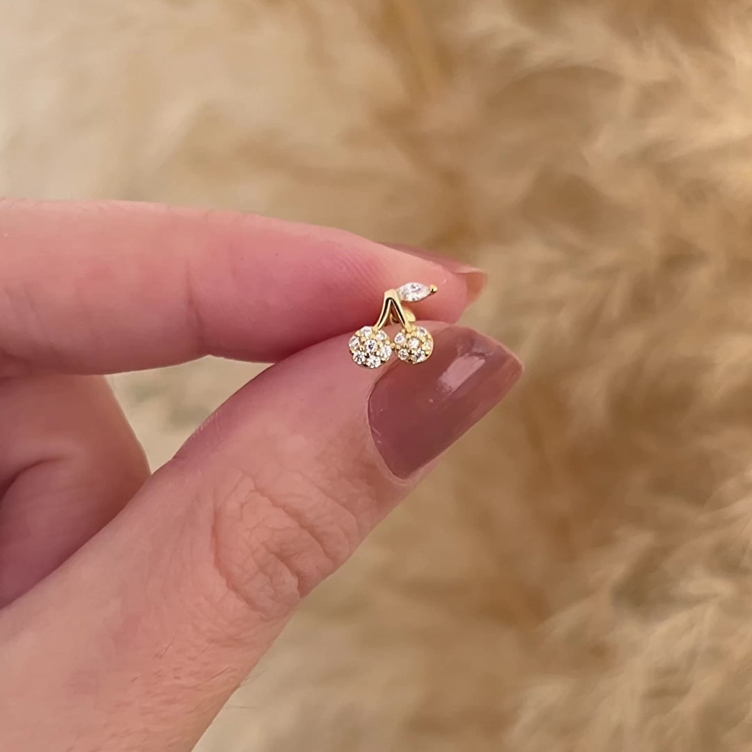 Unidad de pendiente con un diseño fresco y brillante inspirado en dos cerezas. Está decorado con circonitas blancas brillantes de alta calidad. Tiene cierre de bola, por lo que es muy cómodo de llevar ya que no molesta en la parte de atrás de la oreja. ¡Combínalo a tu gusto!