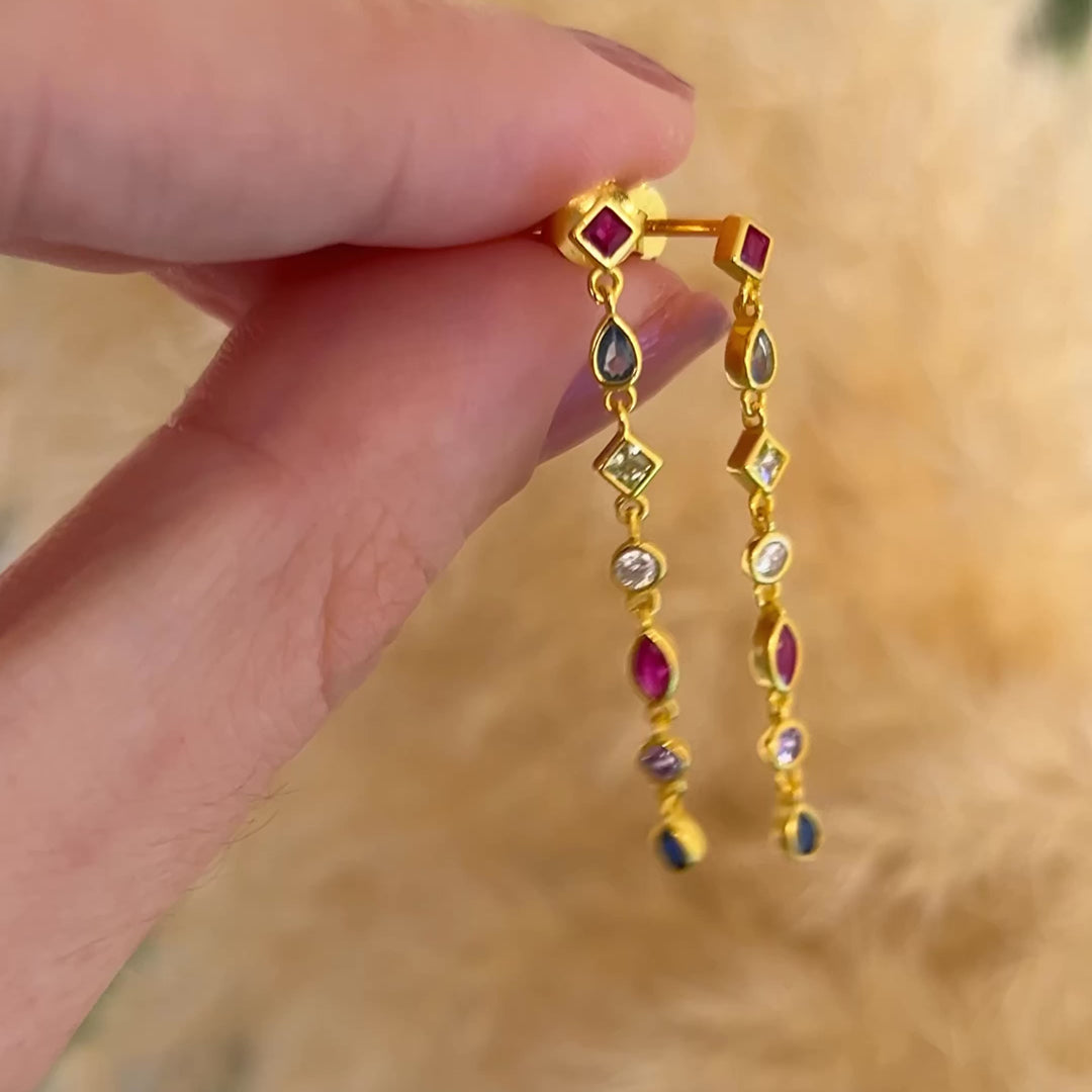 This pair of earrings has a chain formed by encrusted zircons. The closure is button type. Let yourself be seduced by its colored zircons and different precious shapes.